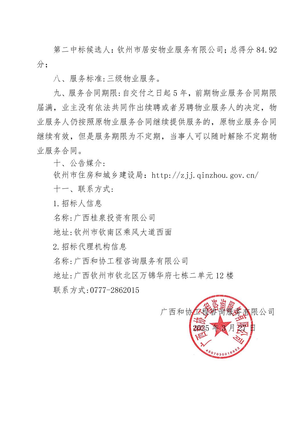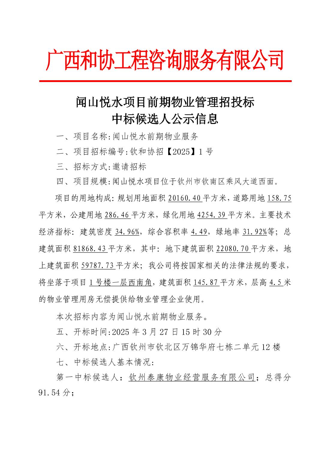 闻山悦水项目前期物业管理招投标中标候选人公示信息