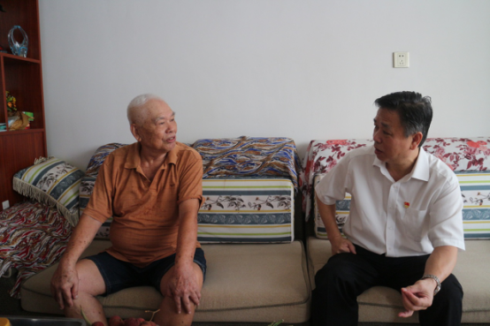 图为市住房城乡建设局党组成员黄兆雁(右)与老党员黄永忠(左)亲切交谈