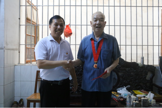 家住钦南区水东公寓退休党员干部陈统钿是钦州市住建系统发展的见证者,今年83岁高龄,是党龄超过50年的老党员。覃振康与陈老亲切交谈,“感谢陈老为钦州住建事业作出的贡献,您是我们党的宝贵财富,我们要向您学习、向您致敬,同时也祝您健康长寿”。并关切地询问老人的生活起居、子女工作等情况,随后把“光荣在党50年”纪念章颁发给陈老,送上祝福和慰问金。覃振康说,颁发“光荣在党50年”纪念章,是党中央对老党员的政治关怀,我们党不会忘记老党员们的贡献。